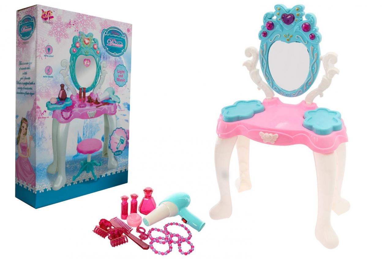 Toaletka dla małej damy, która zawiera szykowny stolik z lusterkiem, krzesełko oraz akcesoria.