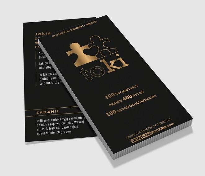 TOKI to książka z wyrywanymi kartkami, dzięki czemu zamienia się w talię. Talia składa się ze stu kart. Każda karta to osobny scenariusz rozmowy w Twoim związku. Każdy scenariusz składa się z pytania głównego określającego temat i dwóch lub trzech pytań pomocniczych. Na koniec każdej rozmowy proponujemy wykonanie konkretnego zdania, które ma urzeczywistnić omawiany temat i jeszcze silniej umocnić Waszą więź.