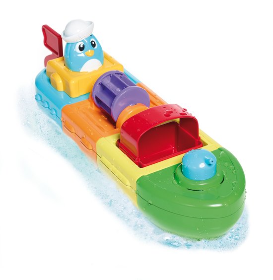 Woda będzie tryskać, gdy maluch naciśnie na peryskop, wlana na turbinę wprawi ją w ruch rozpryskując strugi dookoła! Jest też sitko, dzięki któremu maluch będzie mógł nabierać i przelewać wodę. Dodatkowo łódka posiada napęd, wystarczy nakręcić pojazd, wcisnąć przycisk, a łódka ruszy przed siebie.