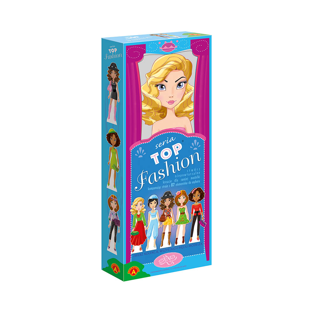 Seria Top Fashion - stwórz niepowtarzalne kreacje dla swojej modelki komponując stroje z 87 elementów do wyboru! Zbierz kolekcję wszystkich pięciu modelek! Zawartość pudełka: plansze do wycinania - 10szt, plansze elementów samoprzylepnych - 2szt, postać modelki z tektury, taśma przylepna, elementy stojaka - 2szt, patyczek, instrukcja.