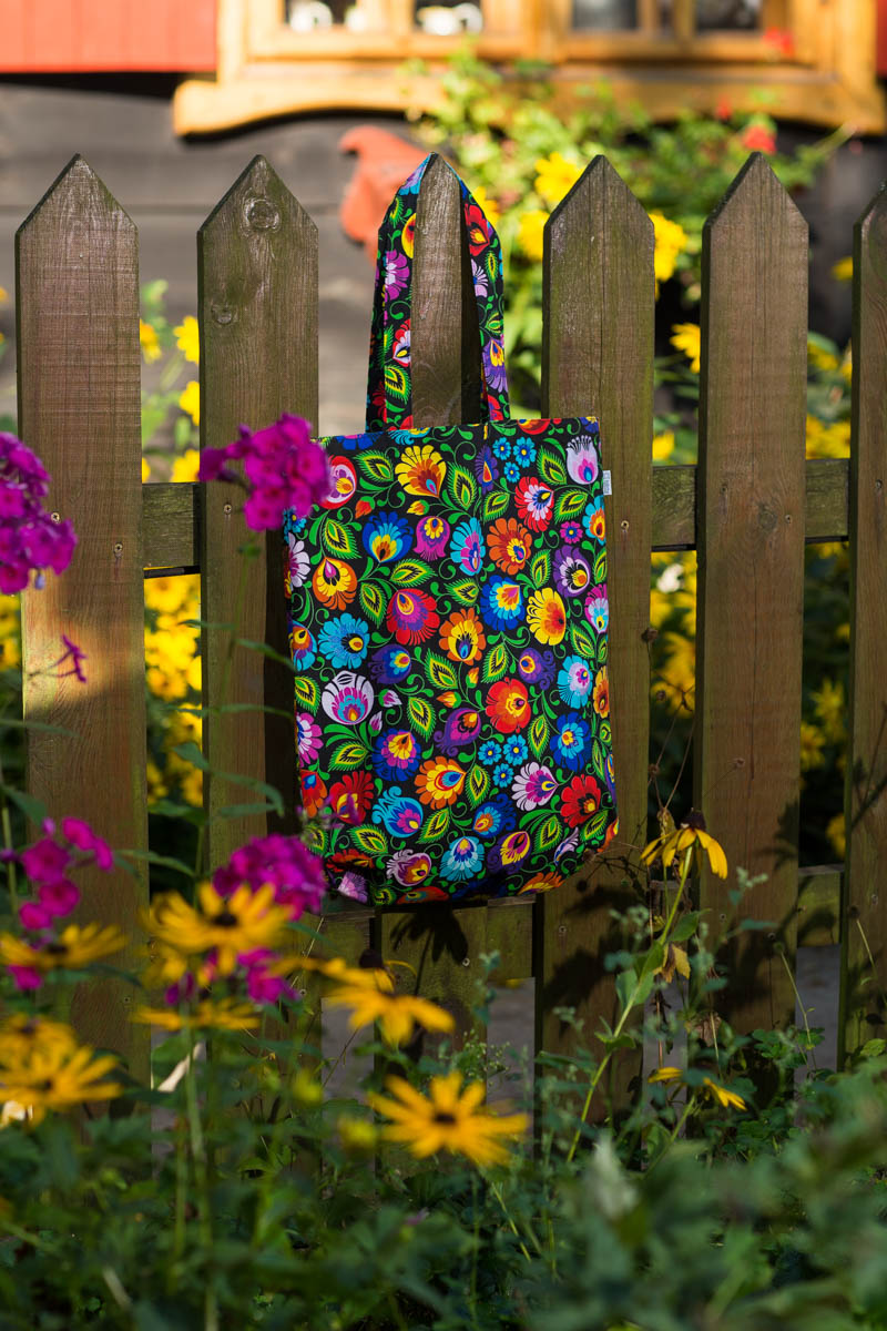 Torba bawełniana w łowickie wzory ludowe z motywem kwiatków, charakterystycznych dla tradycyjnych wycinanek łowickich. Folk torba bawełniana w łowickie kwiaty inspirowana jest tradycyjnymi wycinankami łowickimi - najbardziej rozpoznawalnym symbolem polskiego folkloru. Podstawowymi elementami wycinanek łowickich są koguty, pawie oraz motywy kwiatowe. Wycinanki tworzone są ręcznie z kolorowego papieru, a sztuka ta przekazywana jest z pokolenia na pokolenie. Elementy kwiatów oraz kogutów łowickich można znaleźć w łowickich stylizacjach zaprojektowanych przez Folkstar.
