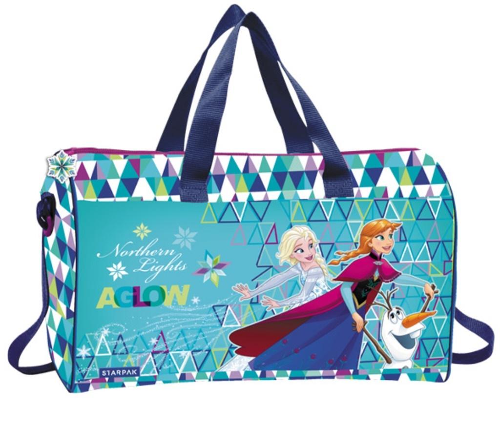 Duża, pojemna torba podróżna idealna na weekendowy wyjazd lub na wakacje. Torba z dwoma mocnymi rączkami i odpinanym paskiem z szeroką możliwością regulacji. Przestronne wnętrze wyściełane podszewką. Całość pokryta brokatem i grafiką z ulubionymi bohaterami.