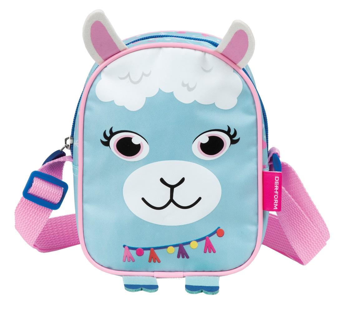 Mała, poręczna, kolorowa torebka z grafiką przypominającą bużkę lamy. Wykonana z impregnowanej tkaniny, zamykana na zamek zakończony ozdobnym pullerem.Wnętrze wykończone jest podszewką. Torebka do noszenia na ramię, długość paska można regulować.