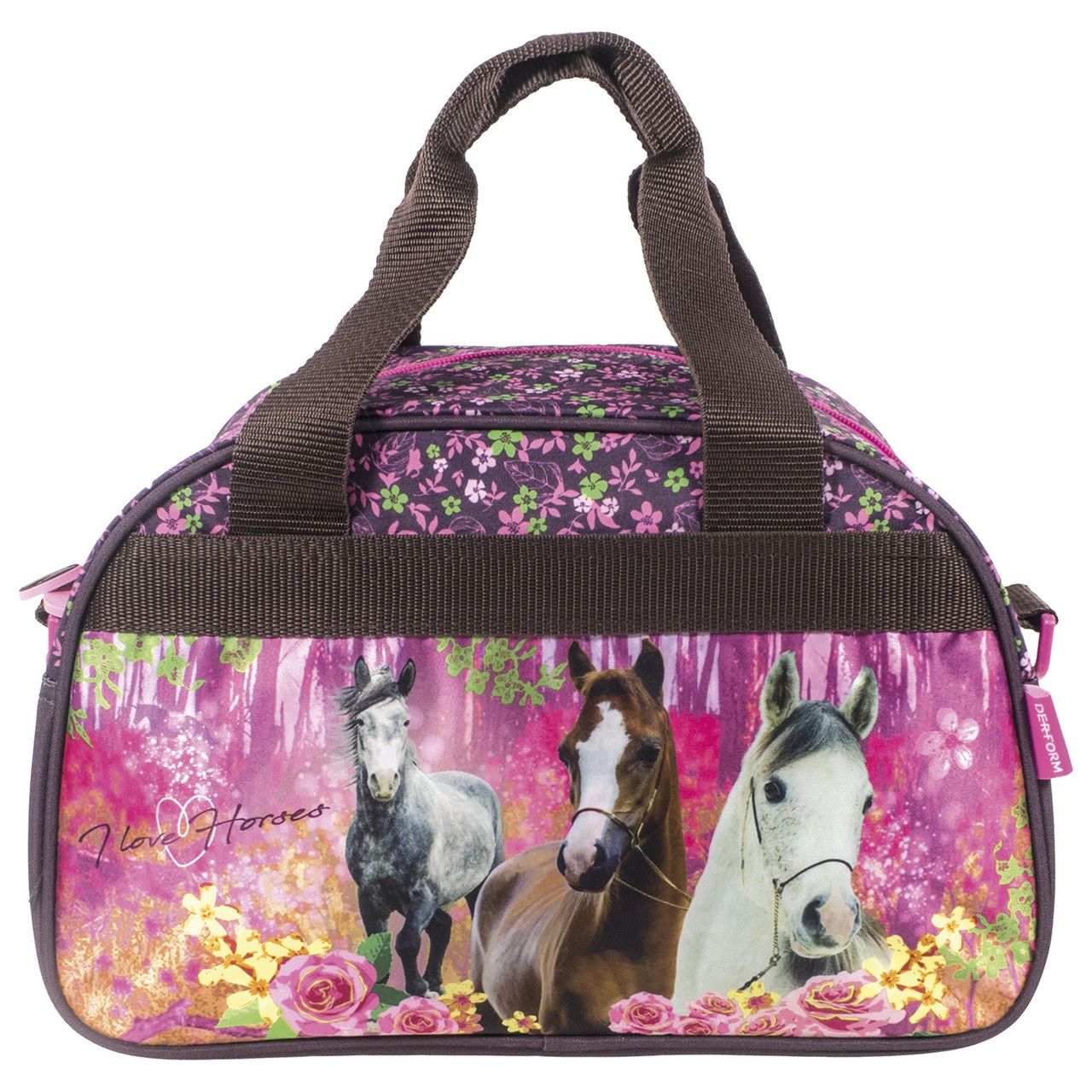 Torba podróżna dla dzieci ozdobiona wizerunkami koni.