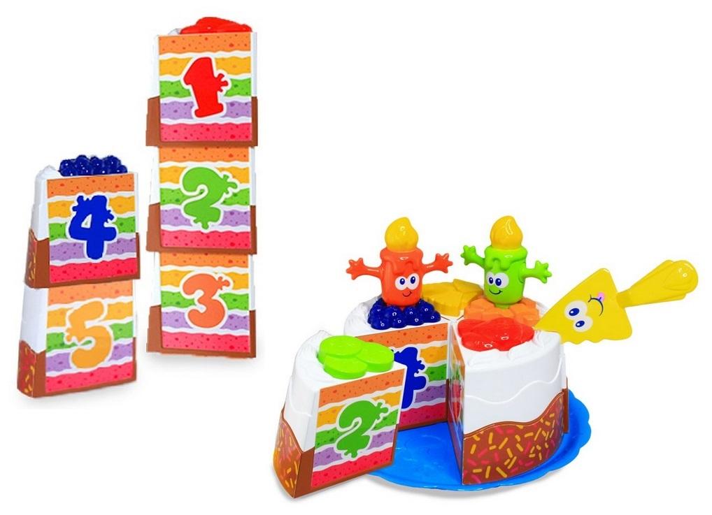Smakowity torcik w formie układanki z zabawnymi świeczkami. W zestawie znajduje się tort podzielony na 5 kawałków, 2 świeczki, talerzyk i łopatka do ciasta. Każdy kawałek tortu ozdobiony jest cyferką oraz innymi owocami, które można do woli przekładać z kawałka na kawałek. Poszczególne fragmenty tortu można układać obok siebie, tworząc okrągły torcik lub nakładać jeden na drugi.