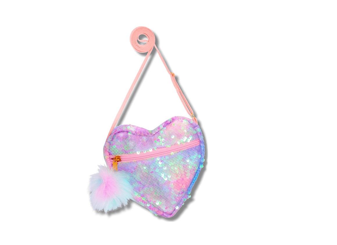 Cekinowo-różowa torebeczka, mieni się wieloma odcieniami dzięki holograficznym cekinom. Torebka ma jedną komorę, zapinaną na zamek błyskawiczny, do którego przyczepiony jest puchaty pompon. Torebeczka posiada regulowany pasek, ze sztucznej skóry. Idealna na prezent dla każdej małej stylistki!