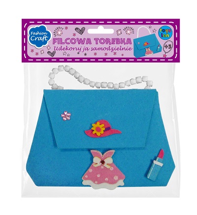 TOREBKA FILCOWA NIEBIESKA Z NAKLEJKAMIZestaw przeznaczony dla najmłodszych projektantek. Zestaw zawiera: filcowe elementy gotowe do zszycia, łańcuszek z koralików, filcowe, samoprzylepne elementy do dekoracji, bawełniane nici, plastikową igłę oraz instrukcję.
