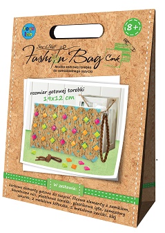 W opakowaniu znajdują się korkowe elementy do zszycia, filcowe elementy z zamkiem, bawełniane nici, plastikowe koraliki, plastikowa igła, zamszowy sznurek, 2 metalowe kółeczka, 2 metalowe zaciski, klej.
