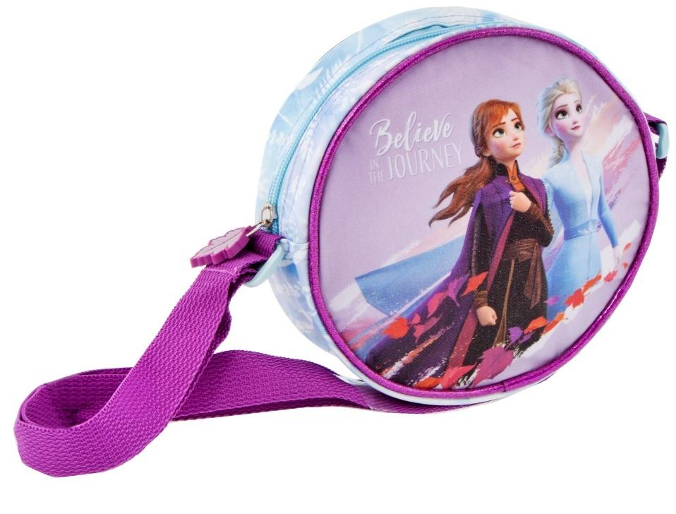 Mała, okrągła torebka na ramię, zasuwana na zamek, pięknie zdobiona bohaterkami Frozen II. Pasek z szeroką możliwością regulacji. Niezbędny element stroju każdej księżniczki i miejsce przechowywania jej skarbów i drobiazgów.