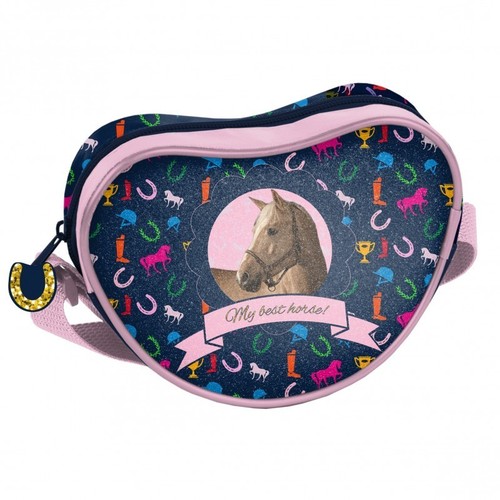 Torebka na ramię, jedna kieszeń zamykana na zamek, kształt serduszka, regulowany pasek. Ozdobne brokatowe dodatki na froncie.