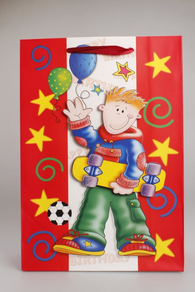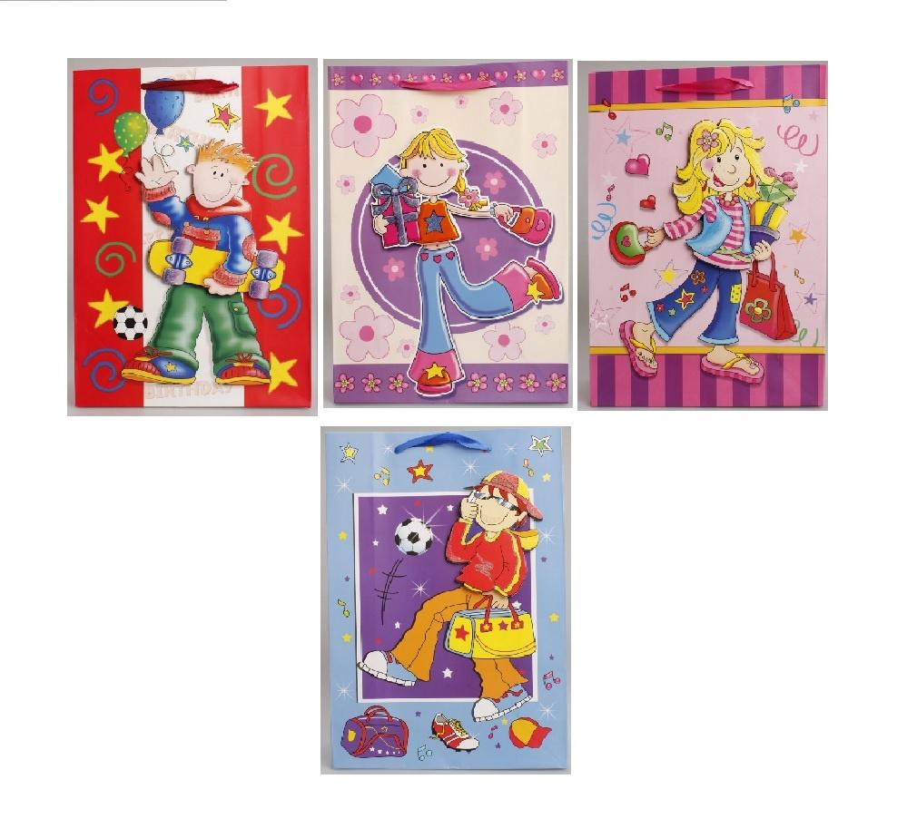 Torebka ozdobna gruba o wymiarach 18x8.5x23cm z motywem dziewczynki i chłopca. wykonana z kartonu 210g pokrytego folią mat. spód torebki usztywniony szarą wkładką. do torebki przyklejone są elementy pokryte brokatem - daje to efekt trójwymiarowości.