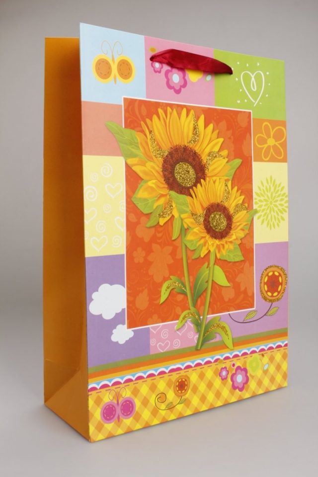 Torebka ozdobna gruba o wymiarach 300x120x430mm. wykonana z kartonu 210g pokrytego folią mat. spód torebki usztywniony szarą wkładką.