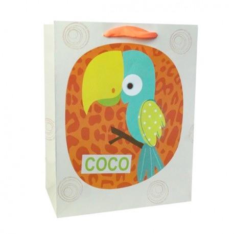 Papierowa torebka prezentowa z nadrukiem tukana. Idealna na prezent dla dziecka.