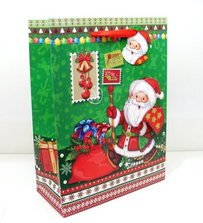 TOREBKA OZDOBNA GRUBA O WYMIARACH 260x100x320MM. WYKONANA Z KARTONU 210G POKRYTEGO FOLIĄ MAT. 4 WZORY. SPÓD TOREBKI USZTYWNIONY SZARĄ WKŁADKĄ. DO TOREBKI PRZYKLEJONE SĄ ELEMENTY POKRYTE BROKATEM - DAJE TO EFEKT TRÓJWYMIAROWOŚCI.