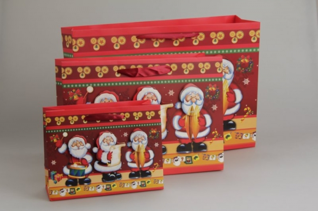 Torebka ozdobna gruba o wymiarach 230x100x175mm. wykonana z kartonu 210g pokrytego folią mat. spód torebki usztywniony szarą wkładką. do torebki przyklejone są elementy pokryte brokatem - daje to efekt trójwymiarowości.