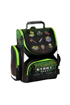 Tornister szkolny. Jedna obszerna komora z wewnętrznym przedziałem. Na przodzie zapinana kieszeń. Dwie kieszenie po bokach: jedna z siatki, druga zapinana na zamek. Ergonomicznie ukształtowane, sztywne plecy. Wygodnie wyprofilowane szelki.