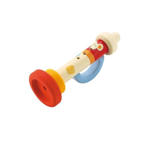 Kolorowa drewniana trąbka dla dzieci w wieku od 2 lat.