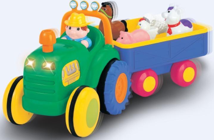 Traktor z przyczepą zawiera 5 zwierzątek, które nagrodzą dzieci dźwiękami za każdym razem, gdy odgadną prawidłowy kształt i włożą zwierzątko w odpowiednie miejsce. Po naciśnięciu komina traktor przez chwilę samodzielnie jedzie do przodu wydając realistyczny odgłos silnika. Po naciśnięciu fotela kierowcy rozlega się dźwięk wesołej melodyjki ""farmer"". Gdy dziecko naciśnie kierownicę można usłyszeć dźwięk klaksonu a przednie światła zaczną mrygać.