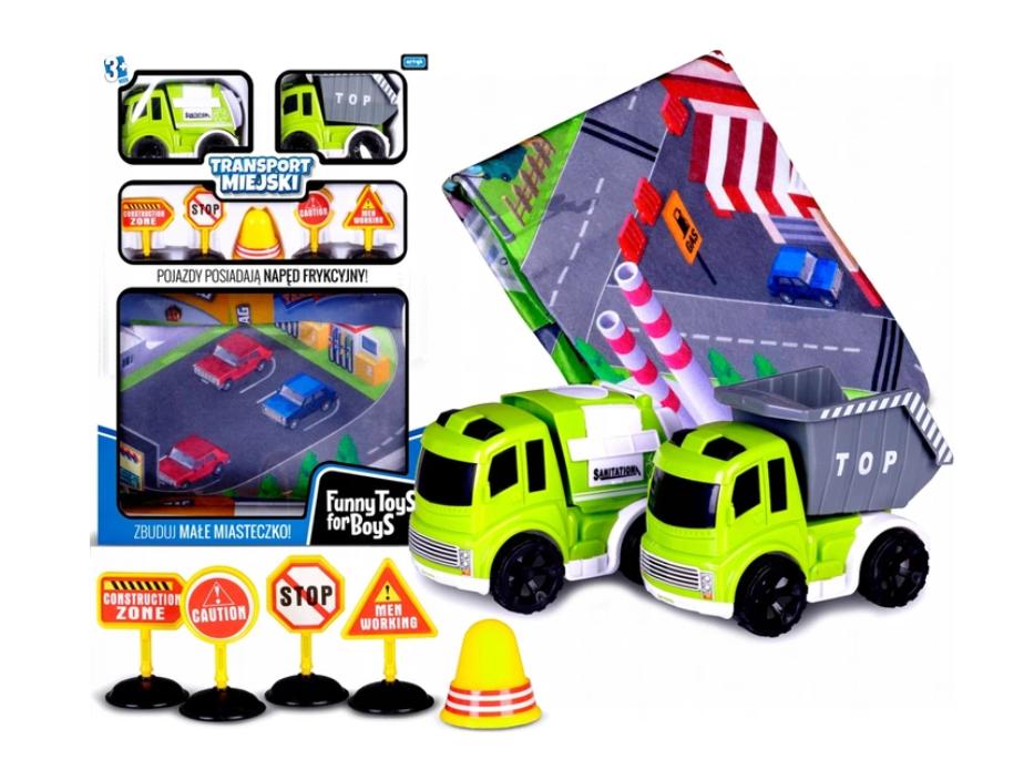 W zestawie: 2 samochody o długości 10 cm z ruchomymi elementami, 4 znaki drogowe, mata 80 x70 cm.