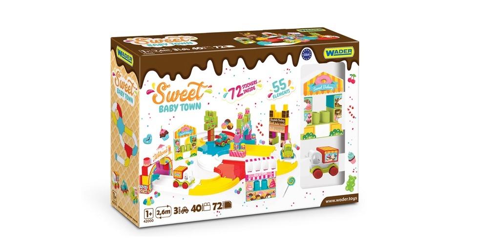 Witamy w świecie słodkości. Nowy produkt marki Wader przeznaczony dla dzieci powyżej 1 roku życia. Sweet Baby Town to miasteczko stworzone z 55 elementów ? zabawek, które uwielbiają dzieci oraz 72 naklejek do samodzielnego przyklejania. Maluchy znajdą tu wszystko, by zbudować własne miasteczko i oddać się wesołej zabawie. Z dużych i wielobarwnych klocków można zbudować fabrykę czekolady lub cukiernię, z elementów drogi autostradę, po której jeżdżą samochodziki wiozące lody i słodycze. Opakowanie z ?okienkiem? demonstruje kolorystykę oraz rodzaj i jakość materiału z którego została wyprodukowana zabawka. Zaletą produktu jest różnorodność elementów, dzięki którym budowanie staje się o wiele ciekawsze i angażujące. II Duże i kolorowe opakowanie, wiele ciekawych i zróżnicowanych elementów, z których można wybudować miasteczko - to idealny zestaw na prezent. Sweet Baby Town składa się z aż 55 elementów ? zabawek, które uwielbiają dzieci oraz 72 naklejek do samodzielnego przyklejania. Maluchy znajdą tu wszystko, by zbudować swoje słodkie miasto i oddać się wesołej zabawie. Z dużych i wielobarwnych klocków można zbudować fabrykę czekolady lub cukiernię, z elementów drogi autostradę, po której jeżdżą samochodziki wiozące lody i słodycze.. Opakowanie z ?okienkiem? demonstruje kolorystykę oraz rodzaj i jakość materiału z którego została wyprodukowana zabawka. Zaletą produktu jest różnorodność elementów, dzięki którym budowanie staje się o wiele ciekawsze i angażujące.