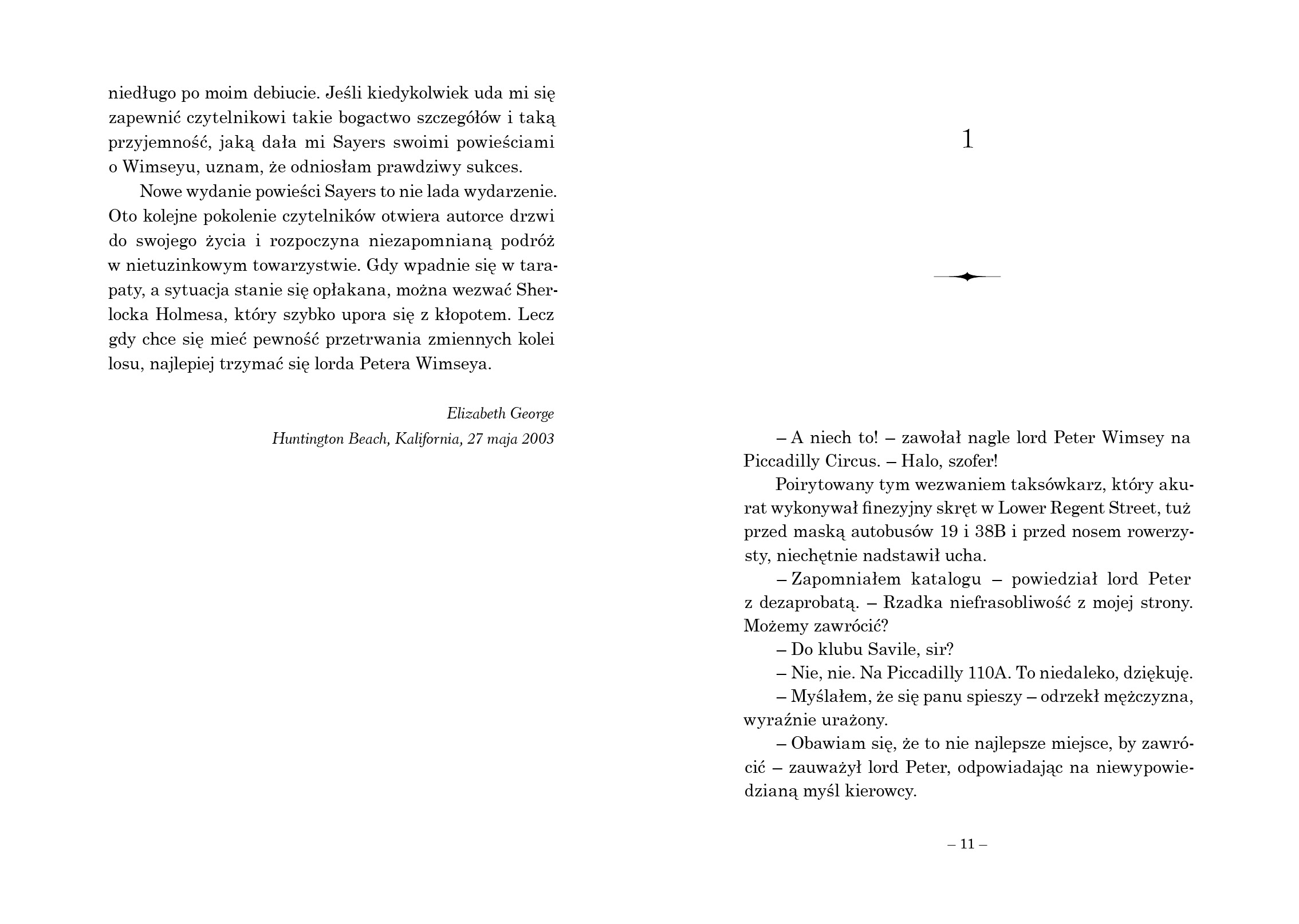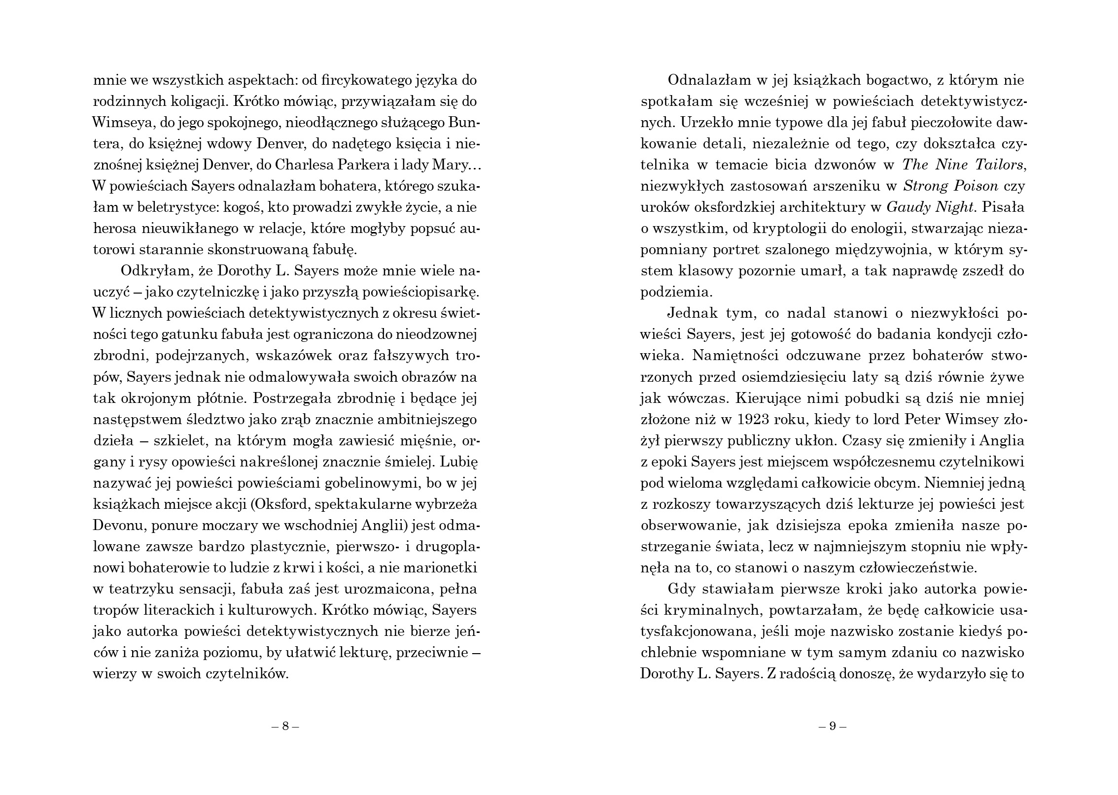 W przygotowaniu kolejne tomy serii. Agatha Christie wytrawnie łączyła wątki, choć są tacy, którzy uważają niektóre z jej postaci za nieco drewniane. Sayers może mniej panowała nad fabułą, ale za to jej proza jest absolutnie wspaniała, a w lordzie Peterze Wimseyu zakochały się już całe pokolenia czytelników. crimereads.com Agatha Christie i Dorothy L. Sayers – dwie wielkie królowe zbrodni, które ożywiły Londyn lat dwudziestych i trzydziestych XX wieku, czyniąc go domem dla Herkulesa Poirot i lorda Petera Wimseya. theartssociety.org Fragment wprowadzenia autorstwa Elizabeth George: Gdyby Dorothy L. Sayers dowiedziała się, w jaki sposób zetknęłam się z jej cudownymi powieściami detektywistycznymi, przewróciłaby się w grobie. Wiele lat temu Ian Carmichael grał lorda Petera Wimseya w kilku filmach, które miałam okazję obejrzeć w publicznej telewizji w moim domu w Kalifornii. Pamiętam, jak spiker wymieniał najważniejsze punkty biografii i imponującej kariery zawodowej Sayers, która była między innymi jedną z pierwszych absolwentek Oksfordu i tłumaczką Dantego. Byłam pod wrażeniem jej osiągnięć, ale jeszcze większe wrażenie zrobił na mnie jej wspaniały detektyw. Obejrzałam ekranizacje, a potem sięgnęłam po książki. [Ten cudowny arystokrata] oczarował mnie we wszystkich aspektach: od fircykowatego języka do koligacji rodzinnych. Krótko mówiąc, przywiązałam się do Wimseya, do jego spokojnego, nieodłącznego służącego Buntera, do księżnej wdowy Denver, do nadętego księcia i nieznośnej księżnej Denver, do Charlesa Parkera i lady Mary… W powieściach Sayers odnalazłam bohatera, którego szukałam w beletrystyce: kogoś, kto prowadzi zwykłe życie, a nie herosa niezaangażowanego w żadne związki, które mogłyby zaburzyć starannie skonstruowaną fabułę. […] Nowe wydanie powieści Sayers to nie lada wydarzenie. Oto kolejne pokolenie czytelników otwiera autorce drzwi do swojego życia i rozpoczyna niezapomnianą podróż w nietuzinkowym towarzystwie. Gdy wpadnie się w tarapaty, a sytuacja stanie się opłakana, można wezwać Sherlocka Holmesa, który szybko upora się z kłopotem. Lecz gdy chce się mieć pewność przetrwania zmiennych kolei losu, najlepiej trzymać się lorda Petera Wimseya. O autorce: Dorothy L. Sayers (1893–1957) – niezwykle popularna brytyjska autorka, poetka, dramatopisarka, eseistka i tłumaczka (między innymi Boskiej komedii Dantego i Pieśni o Rolandzie). Ukończyła Somerville College w Oksfordzie i jako jedna z pierwszych kobiet w Anglii otrzymała stopień naukowy. Choć sama dystansowała się od feministycznych etykietek i wolała być uważana za „po prostu człowieka”, wierząc w praktykowanie praw kobiet bardziej niż w ich głoszenie, krytycy do dziś uznają ją za feministką, a jej książkę Gaudy Night nazwano „pierwszą feministyczną powieścią kryminalną”. Zanim rozpoczęła karierę kryminałopisarki, pracowała jako copywriterka. Jest autorką m.in. sloganu It Pays To Advertise (Reklama popłaca) i wielu niezwykłych kampanii reklamowych.