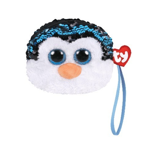 Mini torebka na nadgarstek w kształcie pingwina z błyszczącymi oczami. Można stosować jako portfelik. Wykonana z miękkiego pluszu.Wymiary 13x10 cm.
