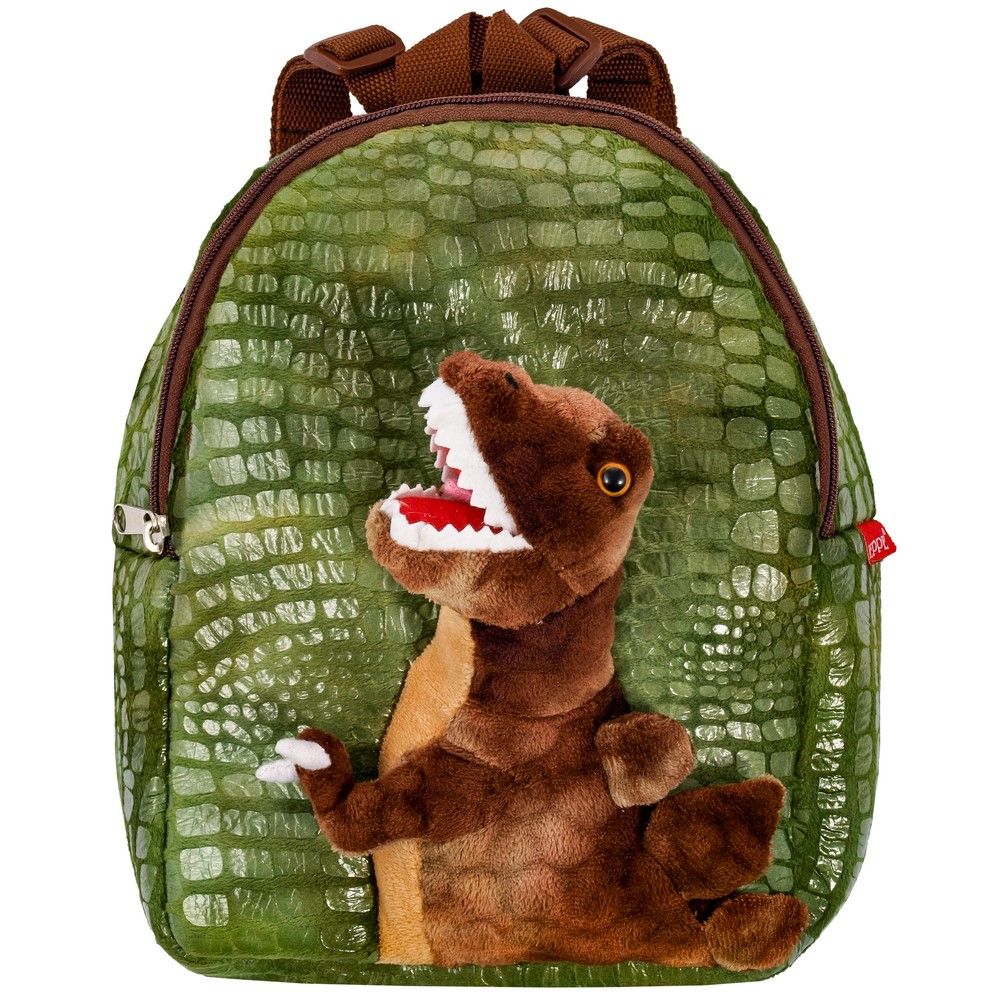Niesamowita kolekcja pluszowych plecaków z dinozaurami.