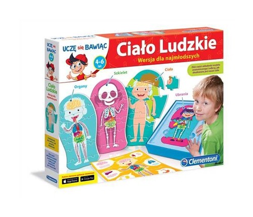 Zestaw edukacyjny, aby poznać budowę i funkcjonowanie ludzkiego ciała. Gra zawiera puzzle, które krok po kroku odkrywają tajniki organizmu człowieka: szkielet, organy,skóra. Dzieci zdobywają wiedzę w łatwy sposób, jednocześnie rozwijając swoje umiejętności logicznego myślenia, obserwacji i współpracy.