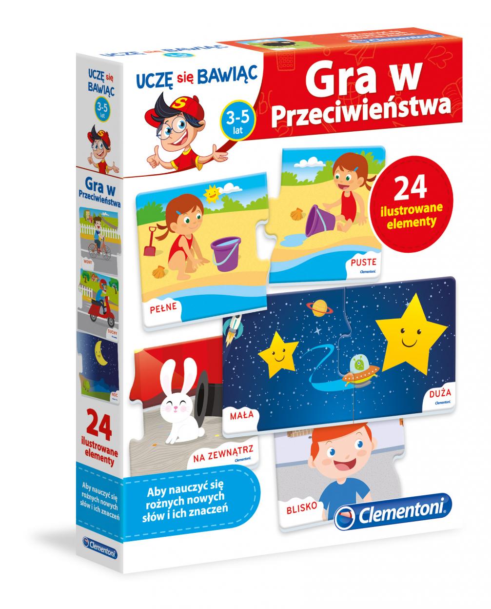 Gra w przeciwieństwa jest prostą i zabawną grą edukacyjną opracowaną po to, by nauczyć dzieci w wieku przedszkolnym różnych słów przy pomocy obrazków ilustrujących pojęcia o przeciwstawnym znaczeniu. Dziecko po odczepieniu elementów od podtrzymującej je ramki powinno przyjrzeć się uważnie każdej ilustracji i dopasować plansze przedstawiające sytuacje o przeciwstawnym znaczeniu. Unikatowe wcięcia pozwalają na autokorektę i umożliwiają samodzielną zabawę. Gra, choć bardzo prosta, spełnia istotną rolę edukacyjną: pozwala na rozwój zmysłu obserwacji i umiejętności logicznego myślenia, a także pomaga dziecku zrozumieć pojęcie przeciwieństwa w odniesieniu do rzeczy, czynności i sytuacji.