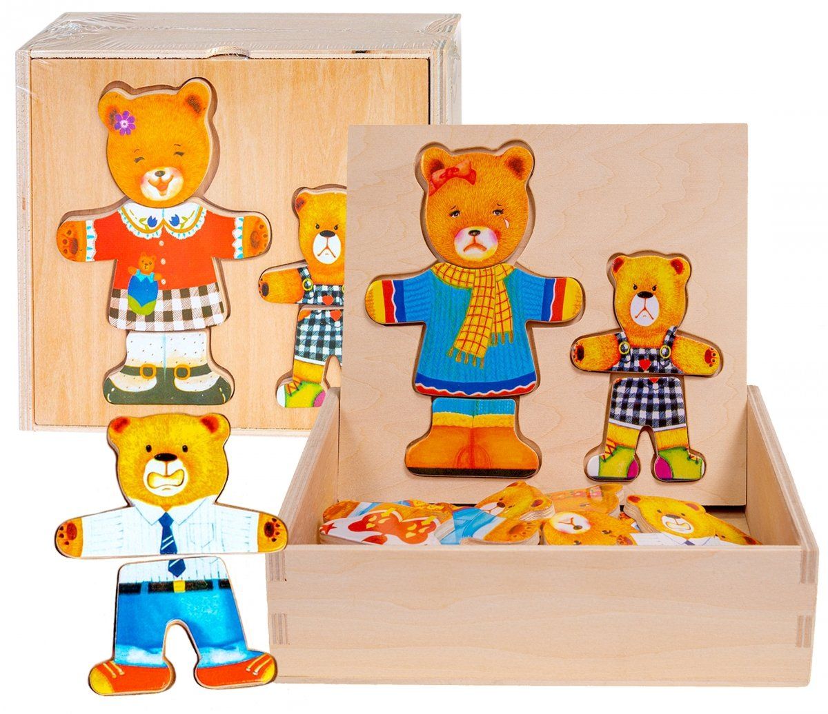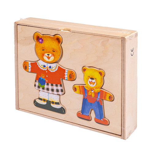 Drewniane puzzle to 2 wesołe misie do układania. Można zmienić im nastrój lub ubranie. Wszystkie elementy umieszczone są w drewnianym pudełku, co ułatwia utrzymanie zabawki w porządku po skończonej zabawie. Pudełko ma również funkcję formy na której układamy odpowiednie elementy.