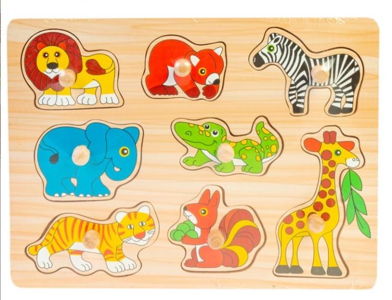 Drewniane puzzle - ramka dla najmłodszych z wizerunkami dzikich zwierząt.