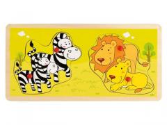 Nauka przez zabawę. Zabawa polega na dopasowaniu przez dziecko wybranych elementów do odpowiadającym im kształtom otworów na drewnianej podkładce.