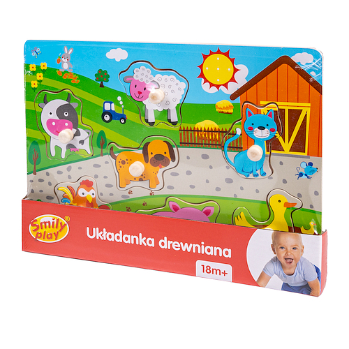 Drewniana układanka puzzle - uchwyty z wizerunkiem zwierząt z wiejskiej zagordy, farmy - Kurki, Kotka, Pieska, Owieczki, Kaczki etc.