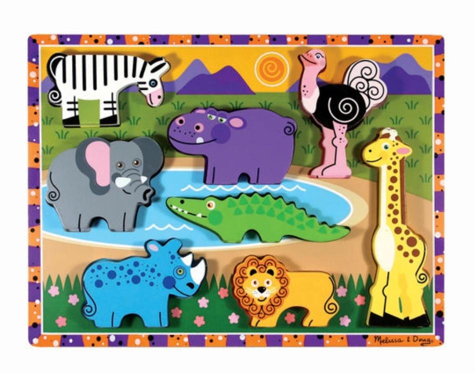Zwierzęcy przyjaciele przedstawieni na drewnianej układance. Dopasuj zwierzaki w odpowiednie miejsce w ramce. Jeśli chcesz możesz też wykorzystać elementy układanki jako figurki do zabawy. Przy pomocy układanki dziecko rozwinie wyobraźnie, poćwiczy koordynację ruchową oraz pozna nazwy zwierząt.