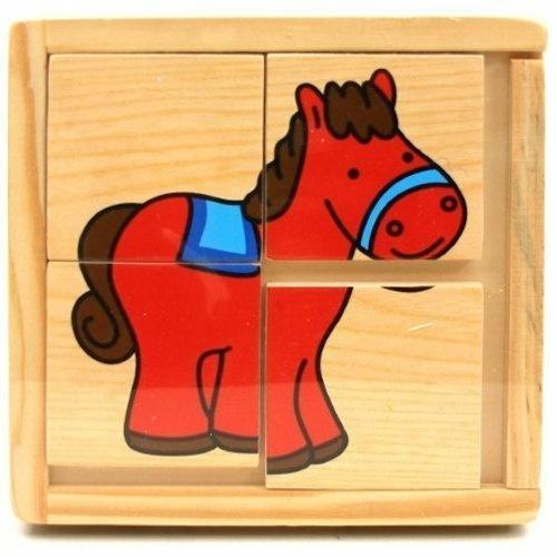 Drewniana układanka - klocki obrazkowe, sześć obrazków po 4 elementy w drewnianym kuferku.