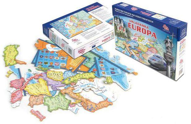 Układanka mapa geograficzno-polityczna. Osoba układająca, po przez zabawę, uczy się geografii i politycznego podziału Europy. Mapa Europy powycinana jest zgodnie z granicami państw, zatem każde z nich jest oddzielnym elementem. Dzięki temu można łatwiej zapamiętać kształt danych Państw, można porównać ich wielkości, zestawiając je dowolnie obok siebie. W trakcie układania uczmy się umiejscowienia ich na kontynencie.Na mapę naniesione są herby państw oraz informacje o powierzchni kraju i populacji ludności. Zaznaczone i opisane są miejsca ważnych wydarzeń związanych z historią Polski. Wymiar obrazka (dł. x szer.) [mm]: 660 x 470.