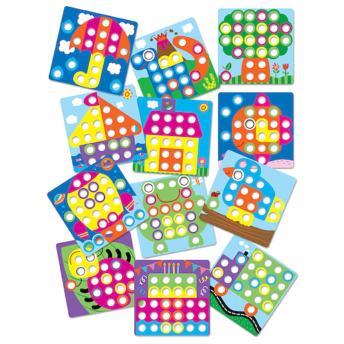 Zabawę zacznij od ściągnięcia przeźroczystej folii i wyciągnięcia kolorowych okrągłych wzorów. Wybierz kartę, zamieść ją na nakładce i zacznij zabawę umieszczając okrągłe elementy w odpowiednie miejsca.