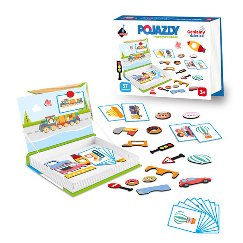 W zestawie 57 elementów - magnetyczne pojazdy, znaki drogowe, ostrzegawcze oraz 8 obrazków z pojazdami. Dziecko może układać na załączonej planszy pojazdy, tworzyć obrazki z załączonych elementów. Super zabawa, podczas której można nauczyć się nazw środków transportu i oznaczeń drogowych. Wiek: 3+ Wymiary opakowania: 26.5x4x19 cm