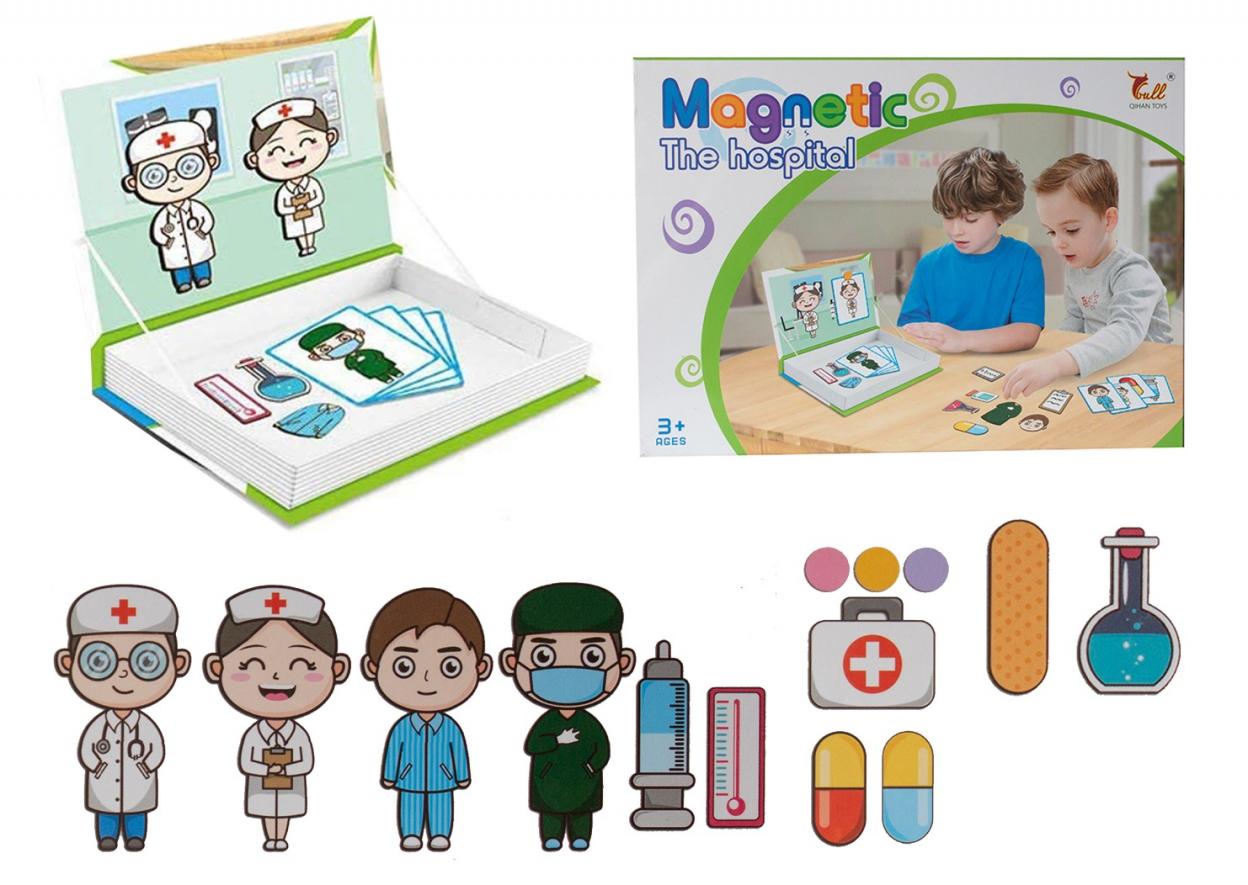 Układanka magnetyczna o szpitalu. W zestawie elementy wyposażenia lekarza, akcesoria i obrazki do układania.