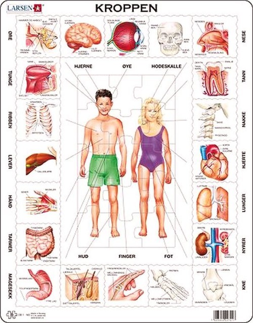 Głowa, ramiona, kolana, palce, żebra i kości... Dołącz do zabawy i ukończ tę rozrywkową łamigłówkę z podwójnym wyzwaniem! W mgnieniu oka dowiesz się ciekawostek o ludzkim ciele i jego organach! Wzdłuż ramki znajdziesz 20 elementów z różnymi częściami ciała. Elementy osadzane są w ramce przy nazwie z prawidłową nazwą części ciała, z której linie prowadzą do partii ciała, gdzie dana część przynależy. Na wewnętrznej układance znajdziesz 15 tradycyjnych, zazębiających się elementów, które tworzą ilustrację chłopca i dziewczynki. Ta edukacyjna układanka dostarczana jest więc w komplecie z 35 elementami i najlepiej nadaje się dla nieco młodszych dzieci, gotowych do nauki o ludzkim ciele.