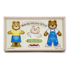 Układanka polegająca na ubieraniu Misiów w różne stroje. Misie - Mama, Tata, Synek i ich ubranka znajdują się w drewnianej kasetce. Wspaniała zabawa w przebieranie Misiów wciąga maluchy na całe godziny! Dodatkowo misiom można zmieniać twarze, które przedstawiają zróżnicowane emocje. Podczas zabawy dziecko ćwiczy wyobraźnię, umiejętność empatii, zdolność do logicznego myślenia oraz zwiększa swoją zręczność w małych rączkach.