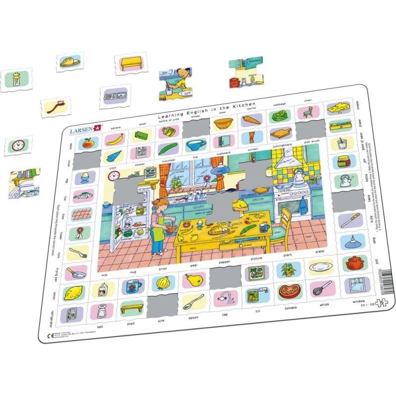 Naucz się 52 angielskich słów z tą łamigłówką edukacyjną. W środku znajduje się mała układanka z 18 elementami i stałą ramką wokół elementów. W puzzlach jest rysunek z kuchni, a 52 angielskie słowa oznaczają 52 rzeczy, które widzisz na rysunku. Na ramkach na zewnątrz znajdziesz te same 52 słowa, a na zewnątrz znajdują się 52 sztuki z obrazem każdej z rzeczy. Każdy kawałek z jedną rzeczą powinien być umieszczony przy odpowiednim słowie. Najpierw umieść kawałki obok angielskich słów, które znasz. Następnie dokończ układankę na środku, a tutaj znajdziesz angielskie słowa, których jeszcze się nie nauczyłeś. Następnie możesz łatwo umieścić pozostałe elementy we właściwych miejscach. Każdy element pasuje tylko we właściwe miejsce, mimo że wyglądają tak samo. Rób to czasami, a zapamiętasz słowa, których się nauczyłeś.