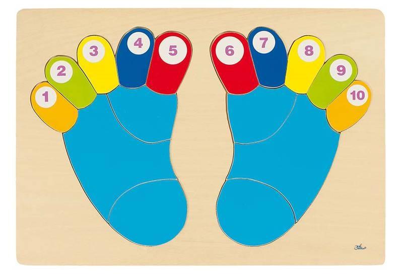 Układanki stopy, składające się z 8 elementów każda, pomagają w nauce liczenia i nazywania kolorów.