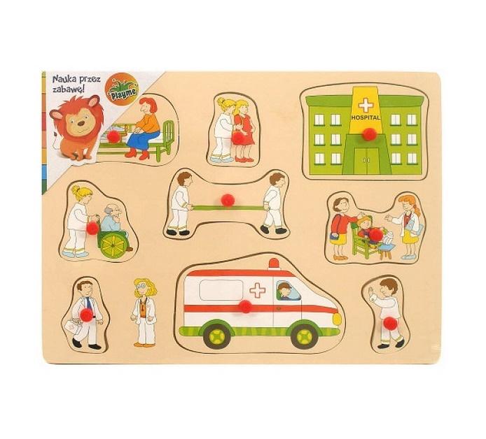 Każdy z elementów do układania posiada pinezkę, dzięki której dziecko z łatwością dopasuje element do odpowiedniego otworu. Zabawka jest bezpieczna dla dziecka ze względu na zaokrąglone kształty
