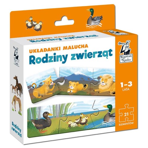 Zestaw Rodziny zwierząt. Układanki malucha"" (13 lata) zawiera 7 trzyelementowych puzzli przedstawiających zwierzęta i ich rodziców, którzy zamieszkują różne miejsca na Ziemi: sawannę, lasy, przydomowe ogródki czy gospodarskie zagrody. Podczas zabawy z puzzlami maluchy rozwijają wiedzę o świecie, a dzięki próbom dopasowywania do siebie elementów doskonalą koordynację oko-ręka.