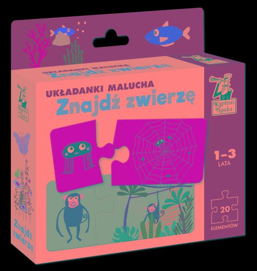 „Układanki malucha. Znajdź zwierzę” (1–3 lata) to 10 barwnych, dwuelementowych puzzli przedstawiających zwierzęta w ich kryjówkach. Maluch wyszukuje zwierzaki na ilustracjach i łączy je w pary. Dzięki temu, że kolory tła są takie same na obu elementach, dziecko może samodzielnie sprawdzić, czy dobrze połączyło układankę. W zabawie z puzzlami maluchy rozwijają wiedzę o świecie, a dzięki próbom dopasowywania do siebie elementów doskonalą sprawność manualną oraz koordynację oko-ręka.