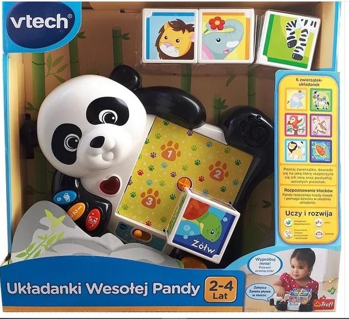 Układanki Wesołej Pandy to elektroniczna zabawka edukacyjna marki VTech, która ucieszy najmłodszych. Zabawka posiada 3 różne warianty zabawy: swobodna zabawa, zagadki oraz melodie. W zestawie znajdują się 4 klocki za pomocą których można ułożyć 6 różnych zwierzątek.