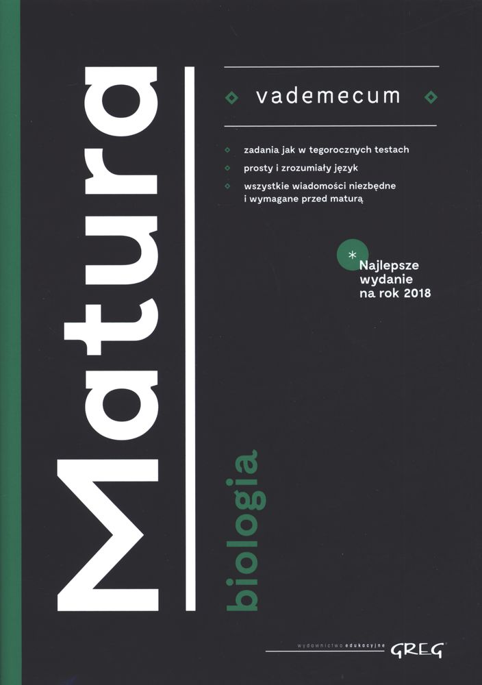 Vademecum Matura - biologia Wydawnictwa GREG to książka zawierająca całość materiału potrzebnego do przygotowań do matury w jej aktualnie obowiązującej formule. Jest zgodna z najnowszą podstawą programową, uwzględnia też treści z klasy I, które dodatkowo oznaczono graficznie.