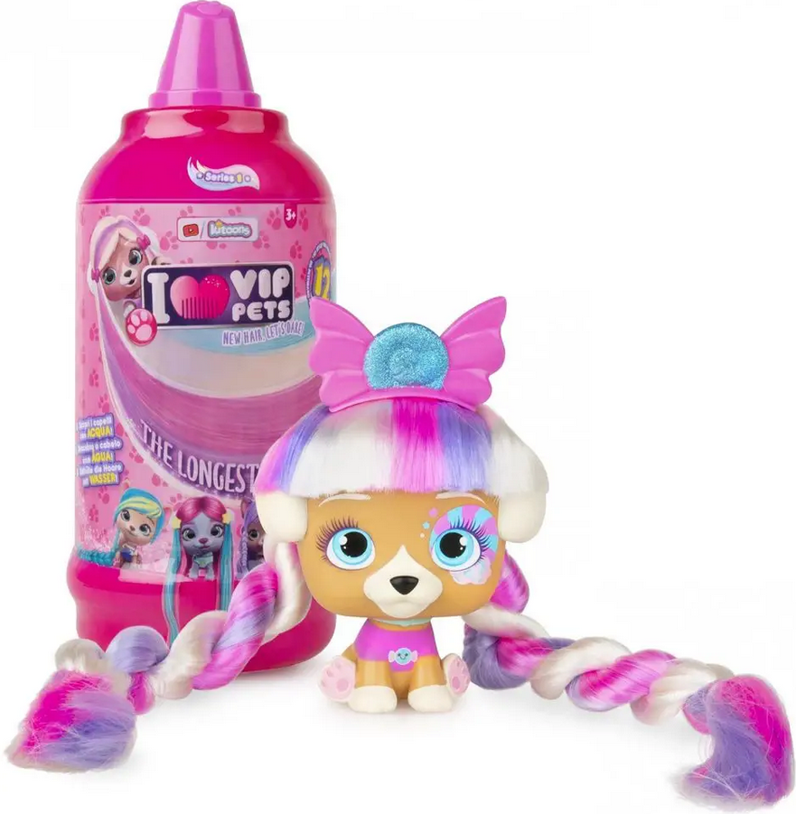 VIP Pets to figurki słodkich psich dziewczynek z długimi i kolorowymi włosami, wyposażone w akcesoria pozwalające na tworzenie wyjątkowych fryzur. W różowych butelkach przypominających opakowanie pianki do włosów znajduje się jeden z 12 słodkich piesków-niespodzianek, gotowych na fryzjerskie stylizacje. By rozpocząć zabawę należy do pojemnika wlać nieco wody, by usunąć z głowy pieska ręcznik skrywający bujne włosy.