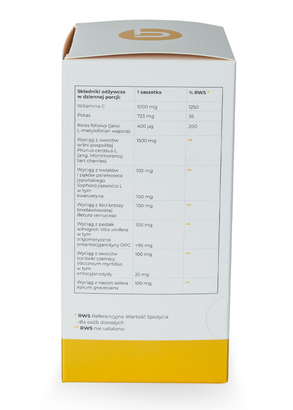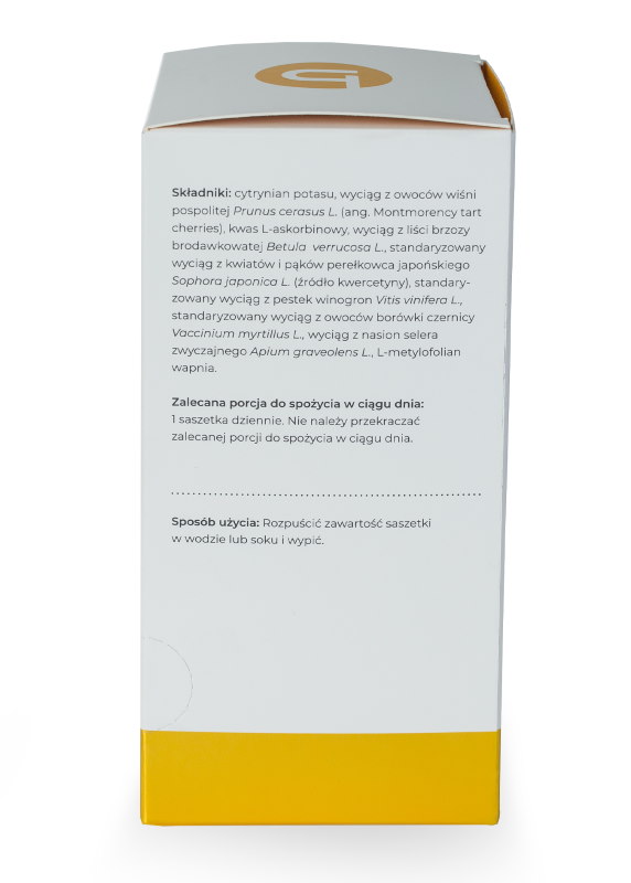 Cytrynian potasu, wyciąg z owoców wiśni pospolitej Prunus cerasus L. (ang. Montmorency tart cherries), kwas L-askorbinowy, wyciąg z liści brzozy brodawkowatej Betula verrucosa L., standaryzowany wyciąg z kwiatów i pąków perełkowca japońskiego Sophora japonica L. (źródło kwercetyny), standaryzowany wyciąg z pestek winogron Vitis vinifera L., standaryzowany wyciąg z owoców borówki czernicy Vaccinium myrtillus L., wyciąg z nasion selera zwyczajnego Apium graveolens L., L-metylofolian wapnia.
